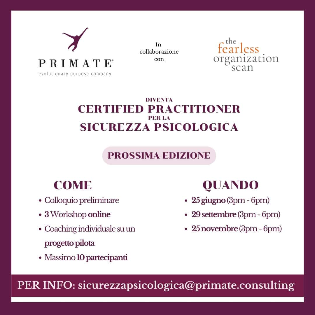 The Fearless Organization Scan è uno strumento sviluppato in collaborazione con Amy Edmondson per misurare il livello di Sicurezza Psicologica che le persone percepiscono all’interno del proprio Team. Insieme hanno creato un network internazionale: PRIMATE è il partner italiano.