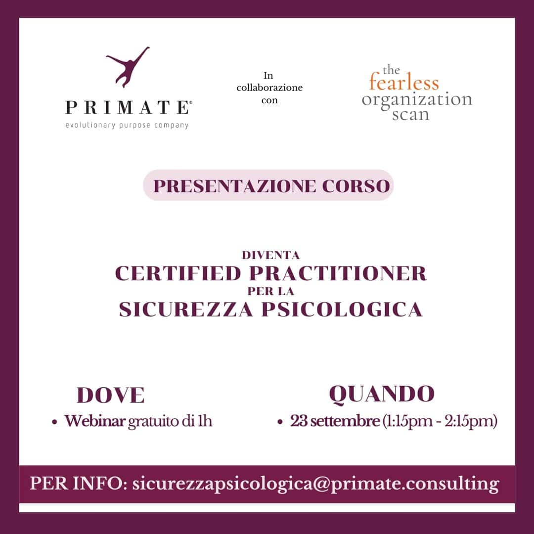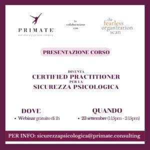 PRESENTAZIONE CORSO – Diventa Certified Practitioner per la Sicurezza Psicologica – Edizione Settembre – PRIMATE Consulting